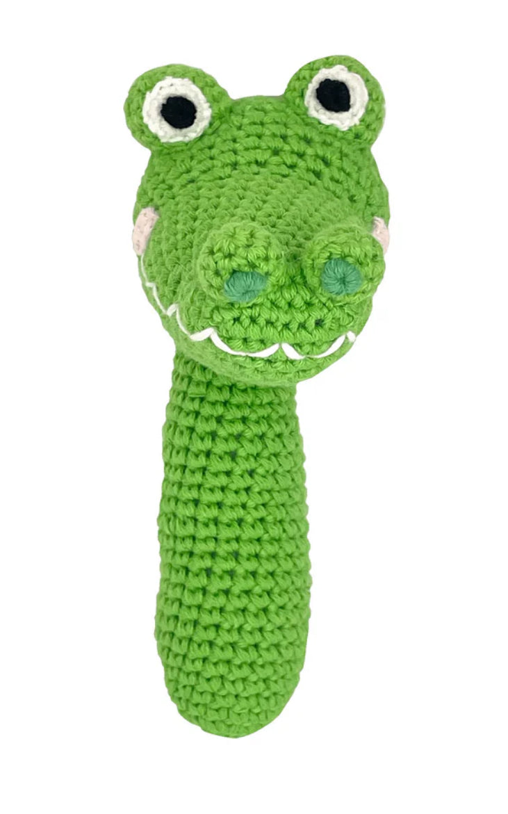 We used a hand crochet technique to create this alligator baby rattle that creates a bumpy texture that is easy for babies to grasp and hold on to while also helping to develop their sense of touch and feel. Our alligator baby rattle is also machine washable so don't be afraid to take