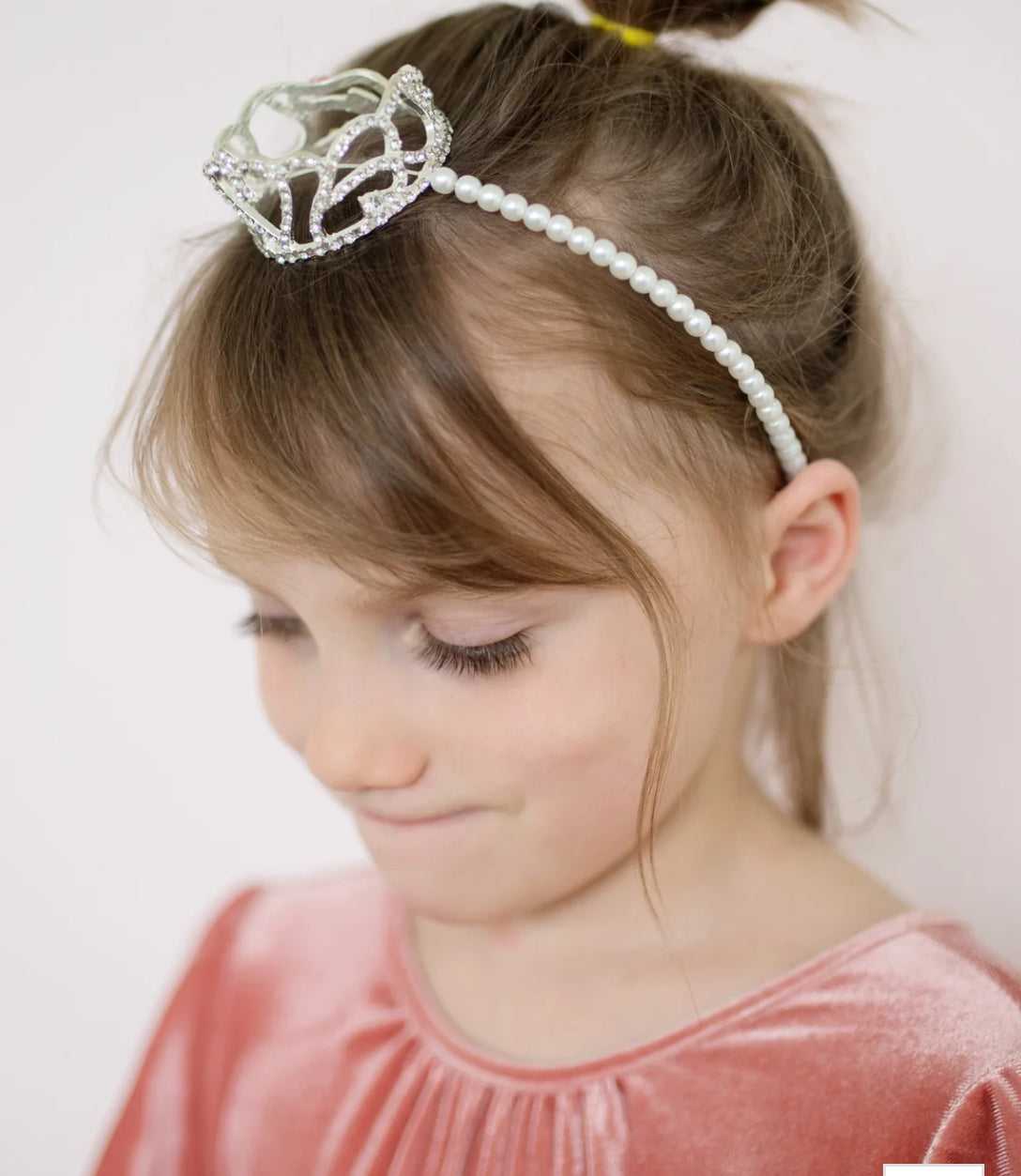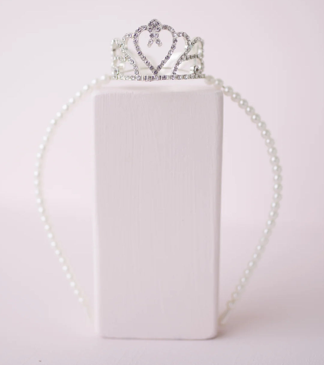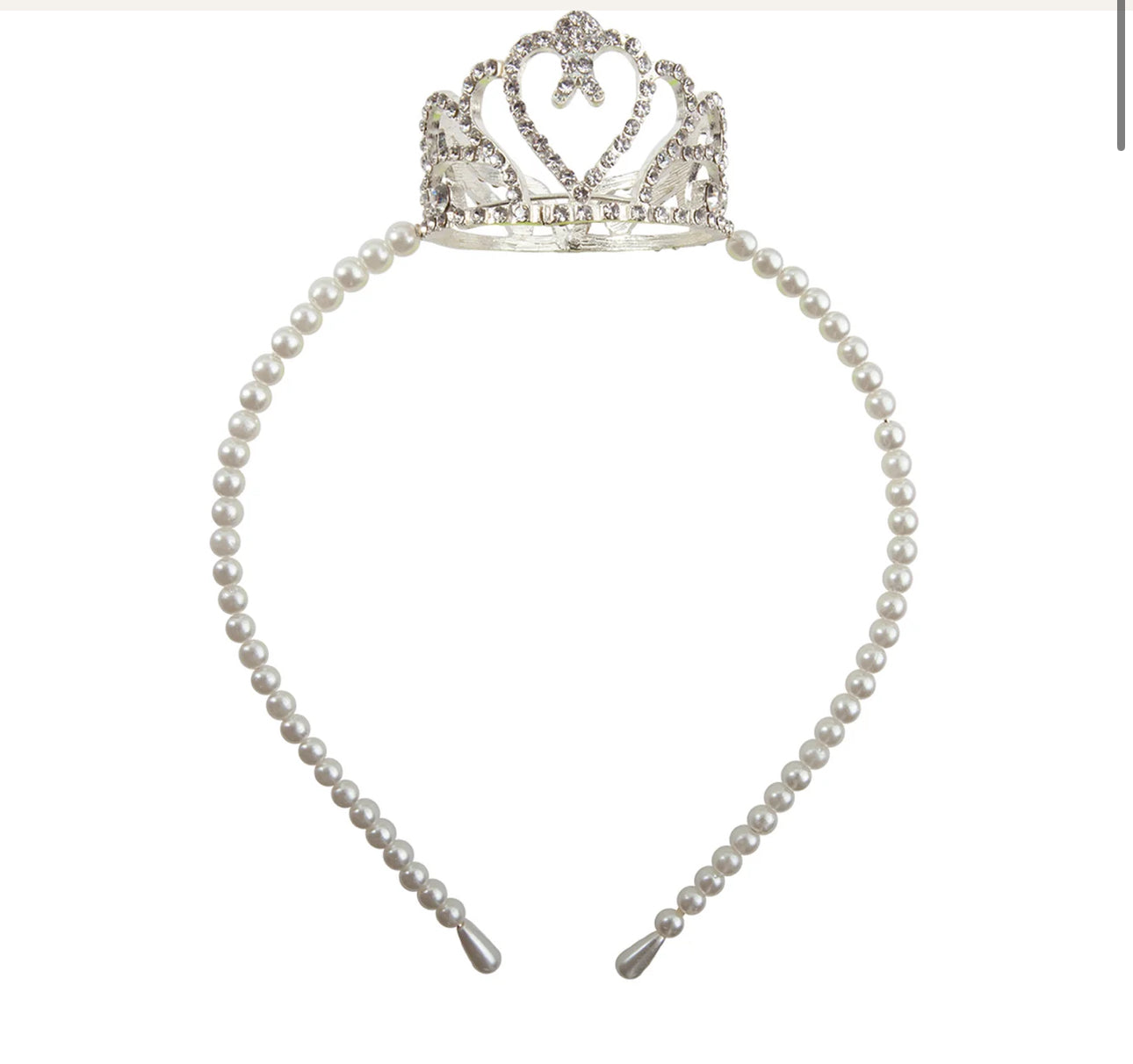Our Boutique Pretty Petite Crown Headband is beautifully strung with white pearls & a full rhinestone crown centered on the top of the headband.