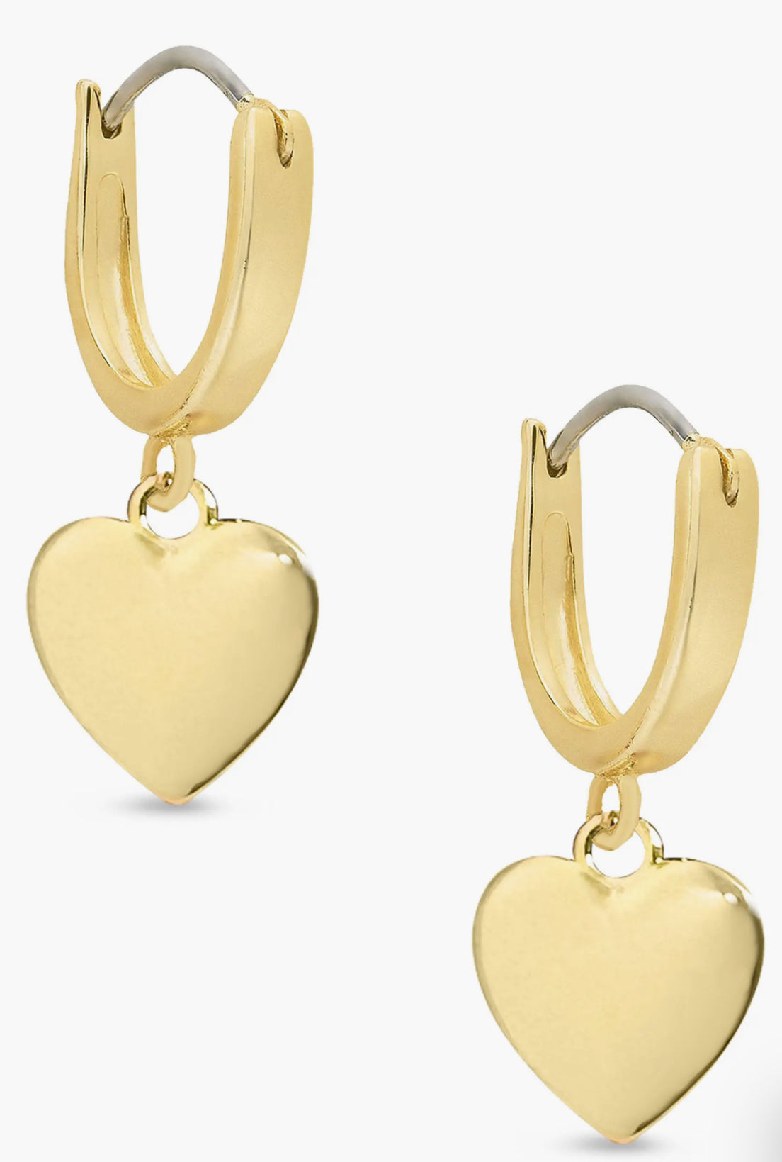 Glossy hearts suspend from these golden hoop earrings that your little one is sure to love.