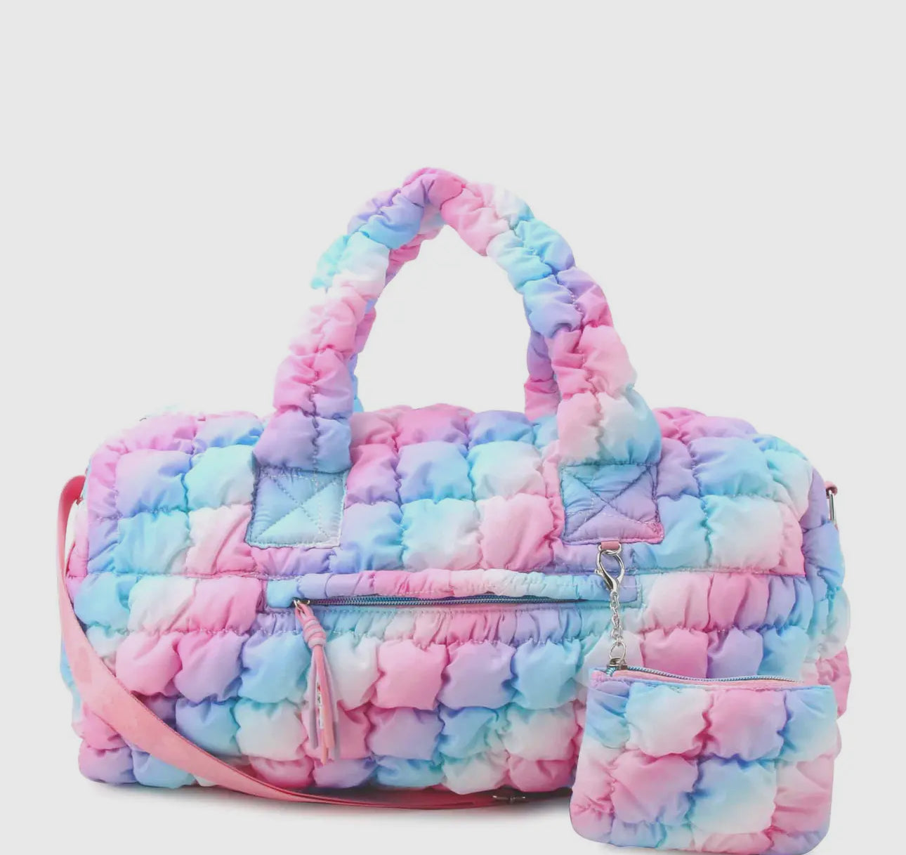 Where style meets versatility, our classic duffle bag silhouette gets a trendy upgrade! From their extra curriculars, to the gym, dance class, weekend getaways, and everywhere else in between - they'll be carrying it all in our new nylon quilted bright ombre print large scrunch duffle bag!