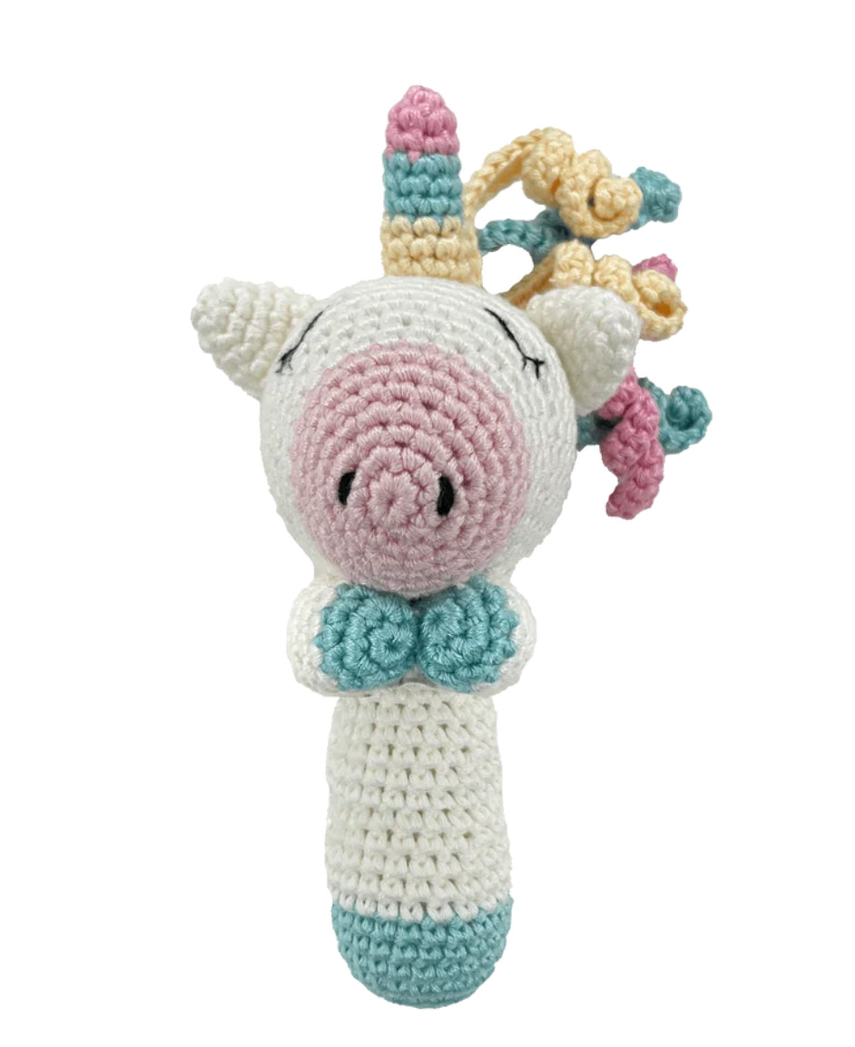 We used a hand crochet technique to create this unicorn baby rattle that creates a bumpy texture that is easy for babies to grasp and hold on to while also helping to develop their sense of touch and feel. Our unicorn baby rattle is also machine washable so don't be afraid to take it everywhere your child goes!
