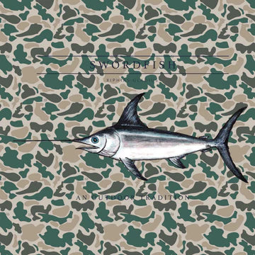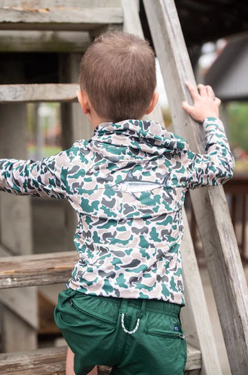 PRODOH Kid's Pro Performance Hoodie T-shirt in Neutral Break Point Camo with Swordfish is a long-sleeve, hooded performance fishing hoodie featuring a full camouflage pattern in shades of tan, green, and black. The camo design resembles a duck camo or classic hunting pattern, offering both functionality and style for outdoor environments. Fabric is a lightweight, moisture-wicking synthetic blend designed for sun protection and breathability. Shirts have a relaxed fit with a straight hem and long sleeves, suitable for layering or wearing alone in warm conditions.Text on the back reads "SWORDFISH" and "AN OUTDOOR TRADITION," with prominent Swordfish graphic across the back shoulders. Available in sizes 6 month-youth large 12/14. Share your Outdoor Traditions with us!