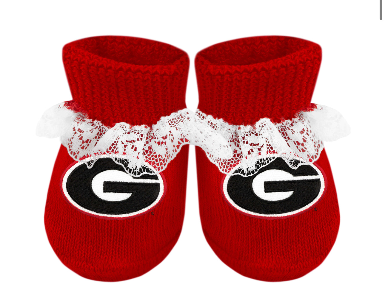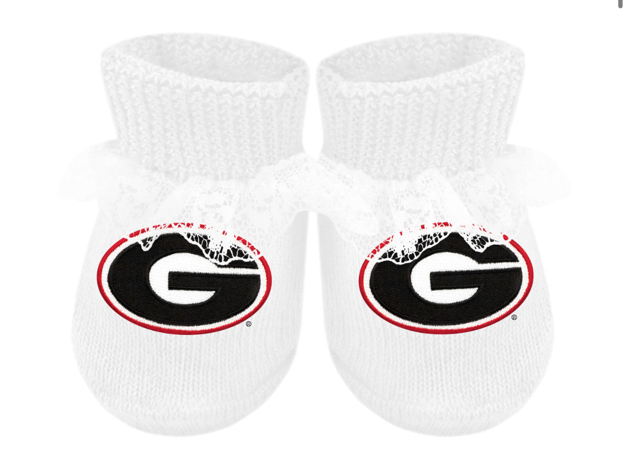 Keep baby's tootsies covered in style with these UGA baby booties! Cotton blend booties are the first step in creating a lifelong fan with the rolled cuffs to keep them in place and the school graphic embroidered on the front.