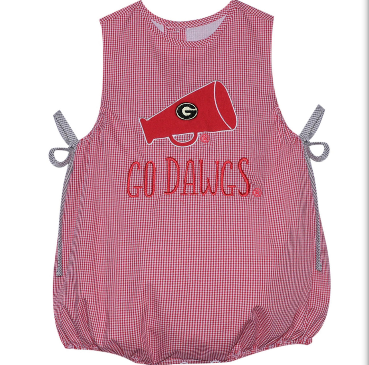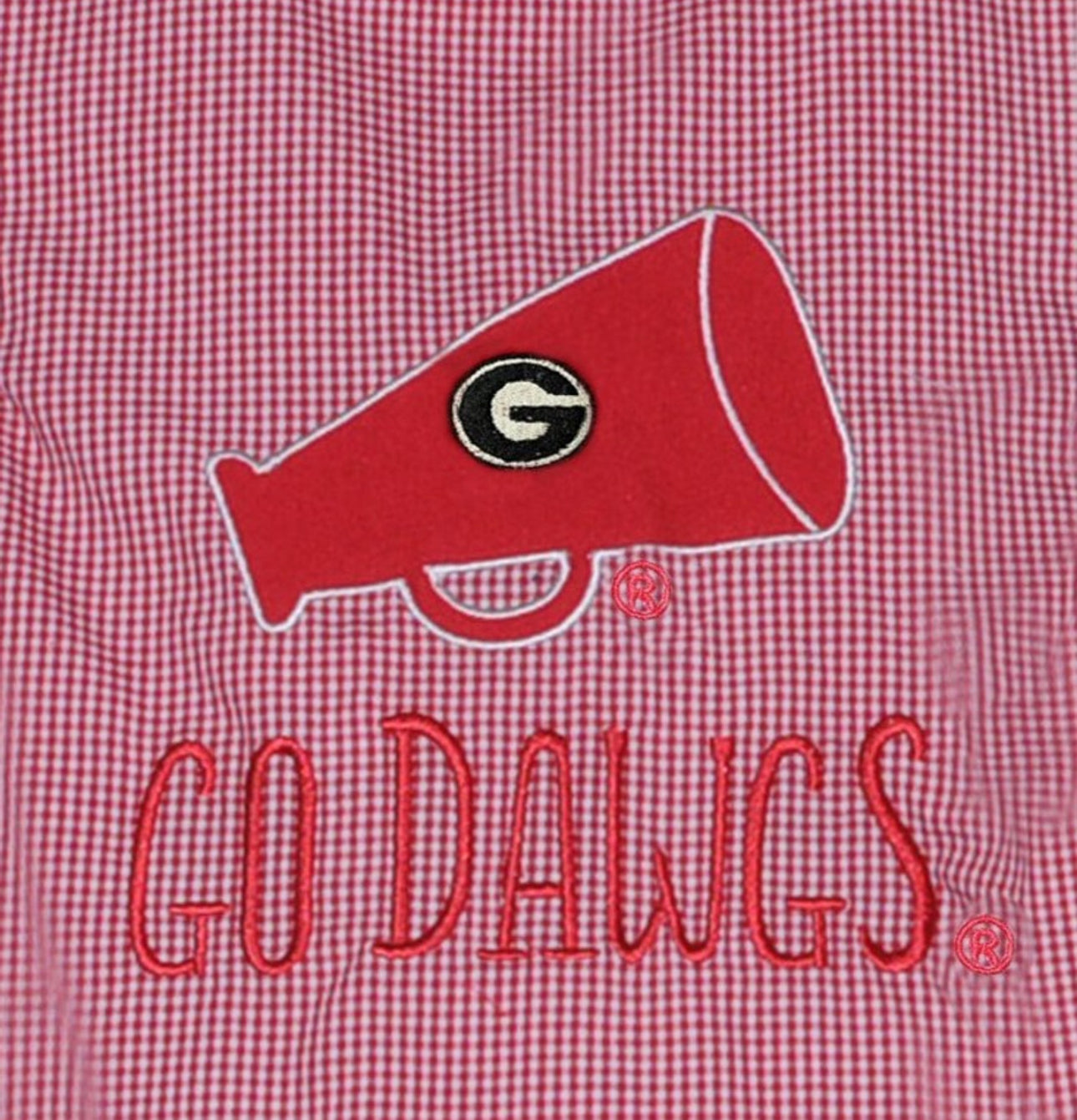 Your little fan will look marvelous in this classic red gingham outfit includes hand embroidered GO DAWGS®, with Megaphone Applique. A precious piece to show your team spirit. Perfect pair with a dress, boy bubble, and shortall to match siblings.