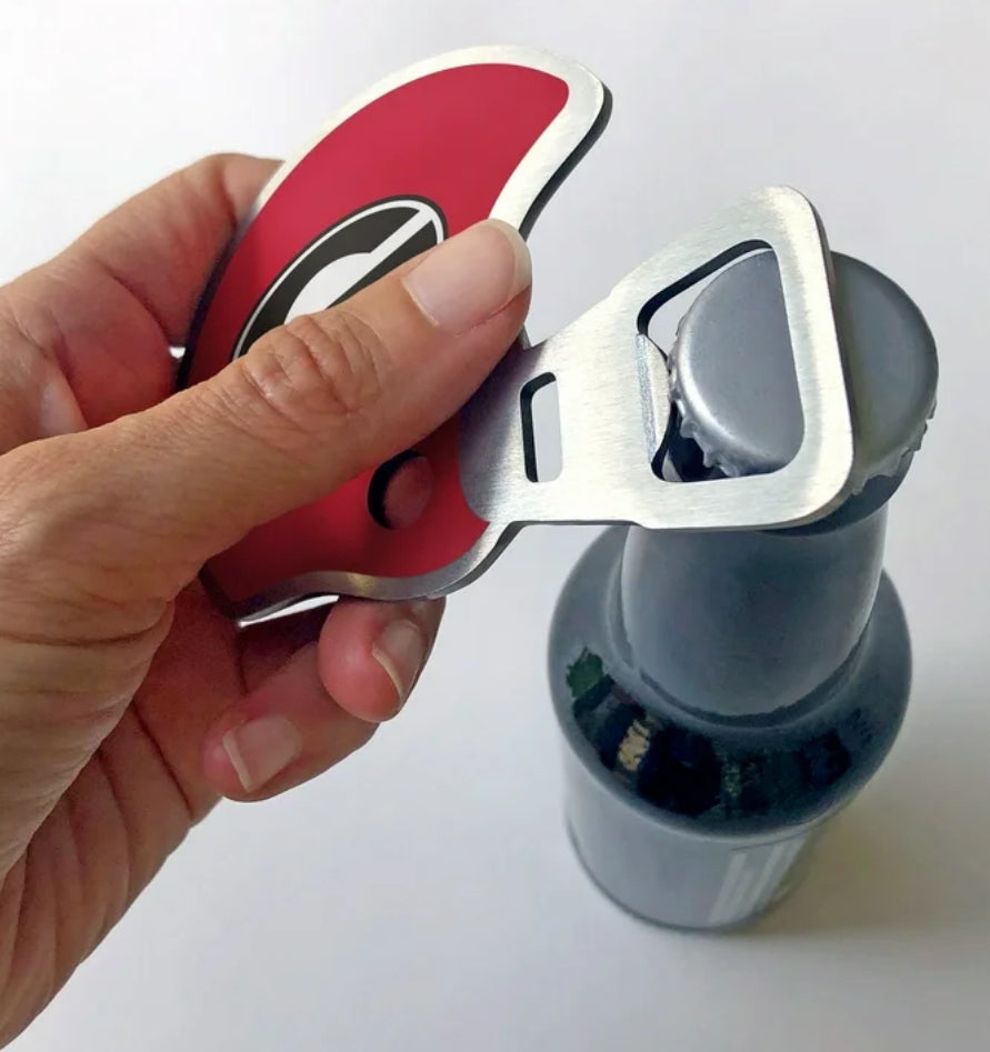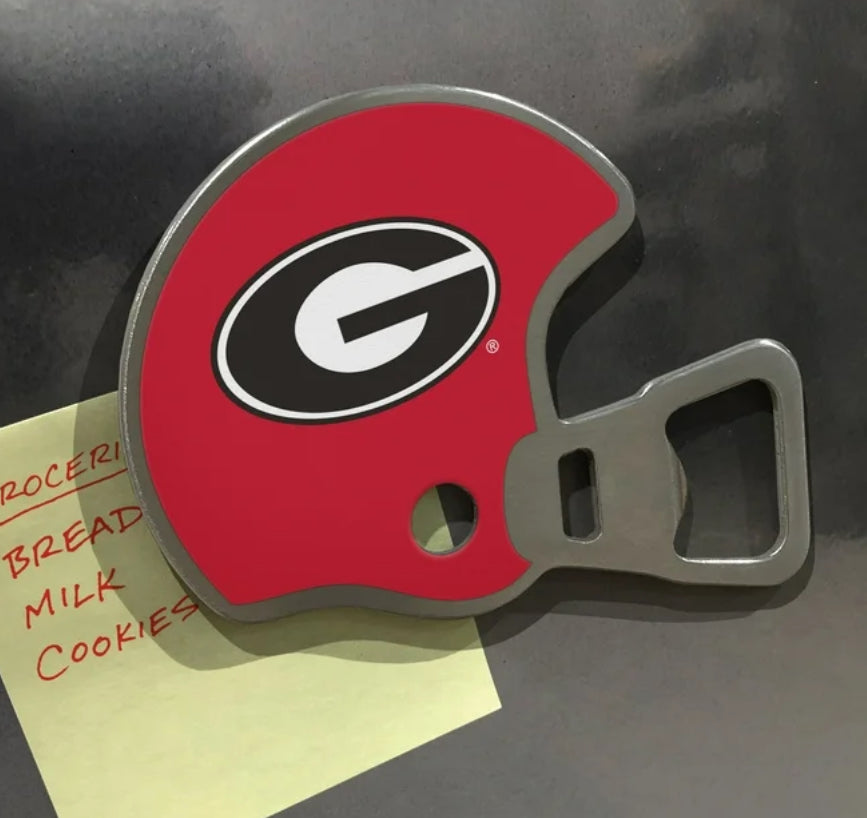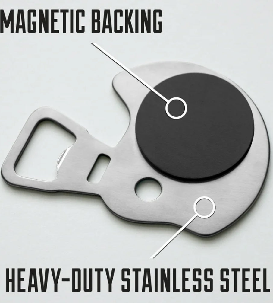 Crack open a win with the Season Opener Bottle Opener! This magnetic, stainless steel bottle opener is like no other! The facemask in the helmet is specially designed to open bottles! And when you're done with it, simply put it on your fridge or any magnetic surface to show off your team pride!