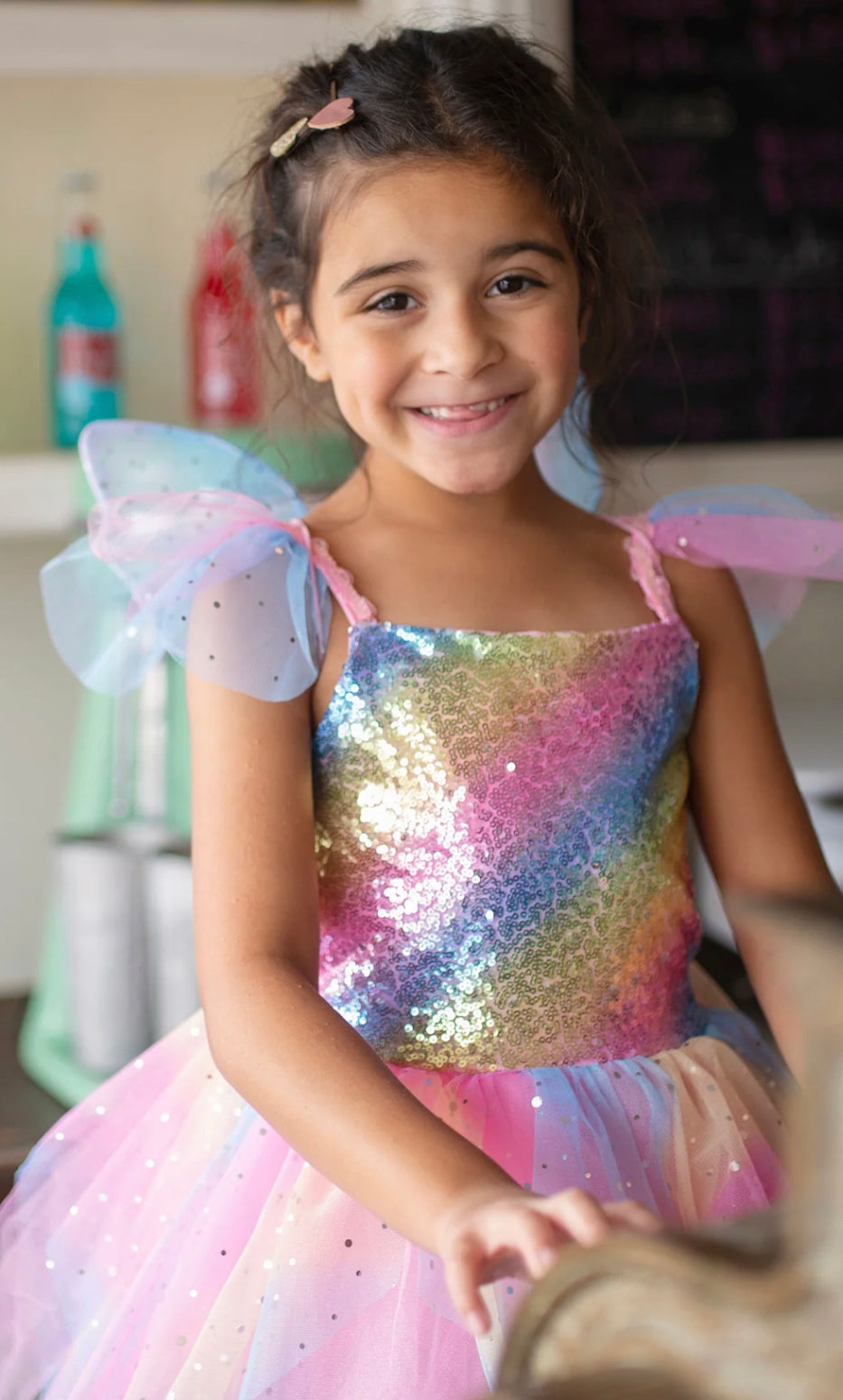 This Rainbow Fairy Dress with Wings is what real fairy dreams are made of! This is a beautiful and comfortable design, bright and sparkly with a layered skirt adorned with shimmery organza petals. Elasticized waistband adds for the comfort of movement and size flexibility. The top is made with rainbow sequinned detailing.
