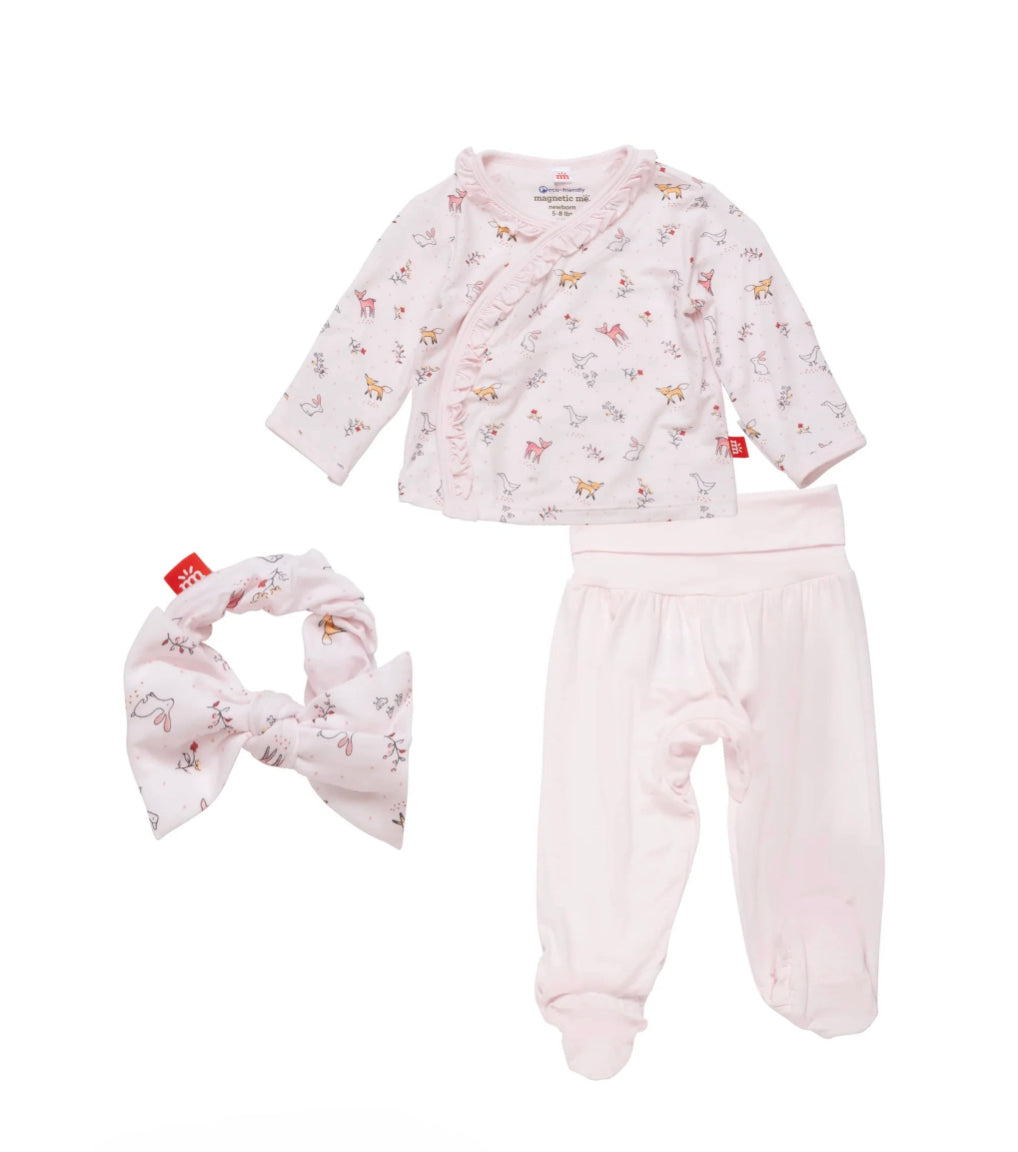 welcome baby in the cutest, comfiest take me home kimono set. the kimono top is designed to be gentle on healing belly buttons with magnetic closures that are great for fast, fool-proof changes, and the entire set is made of softer-than-soft TENCEL™M modal. pack it in your hospital bag as a coming-home ensemble and then use it for the weeks that follow.