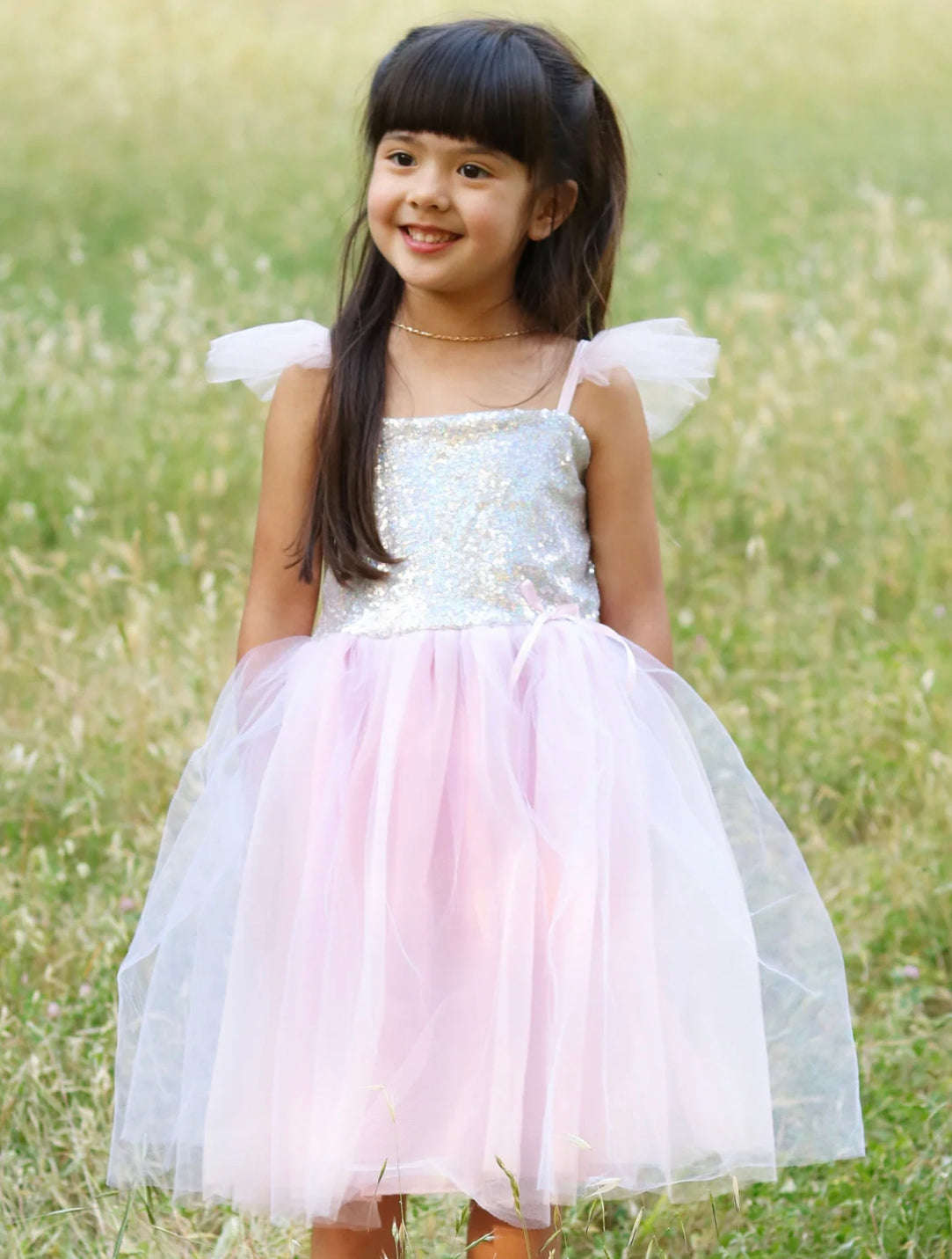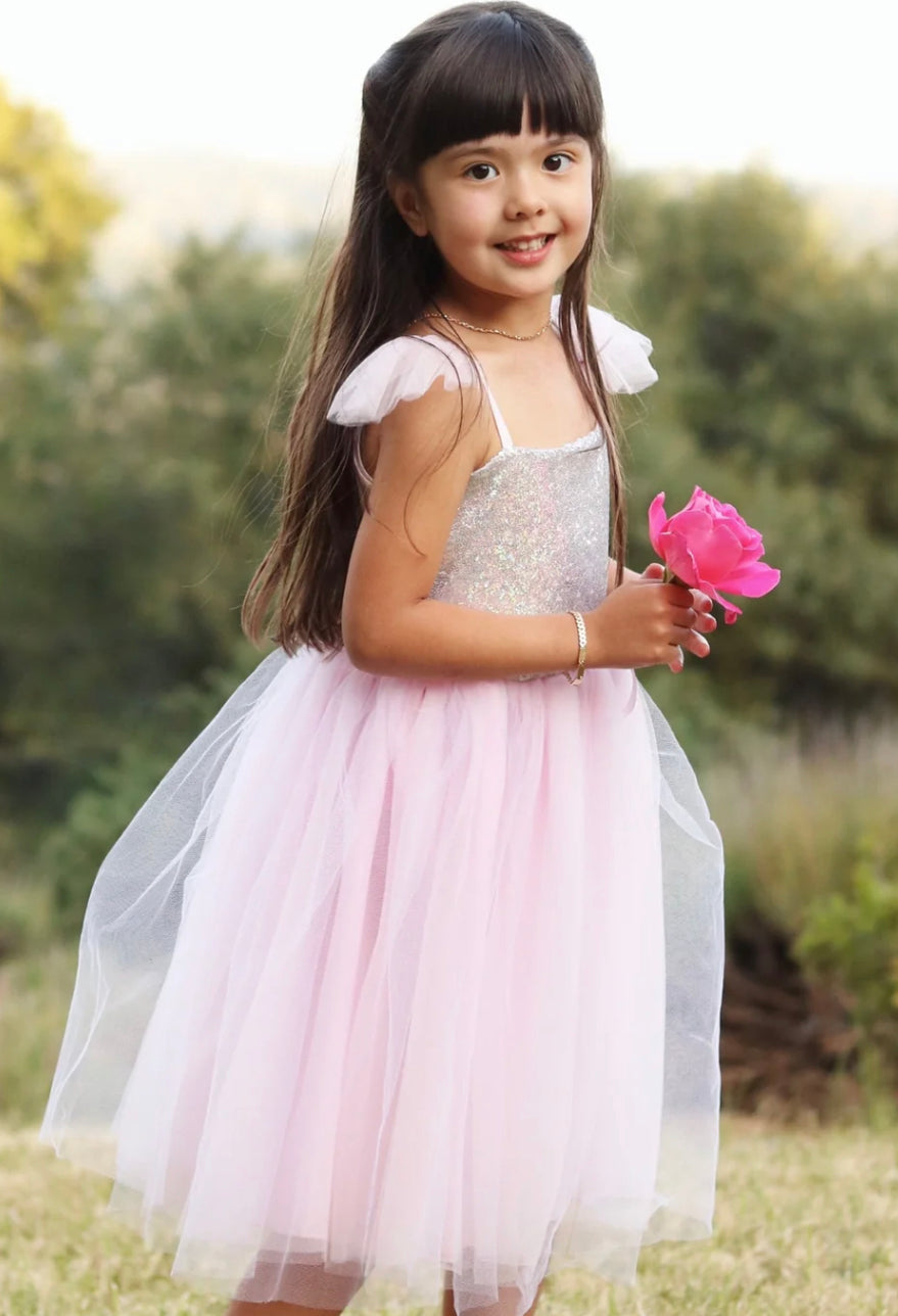 Be a perfect princess in this sparkle and shine pink dress. With 2 layers of soft pink tulle and a layer of iridescent glitter tulle, your skirt will always be fluffy and bright. The sequin top is made from iridescent sequins with a soft stretch spandex lining. The straps are made with stretch spandex and feature tulle puffs. A small satin bow detail finishes this adorable princess dress with a touch of class.