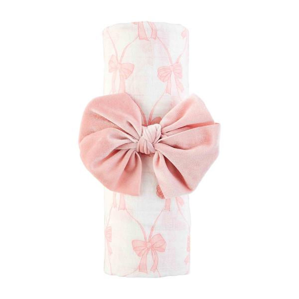 Our Bow Swaddle and Headband Set is so sweet for baby girls! The two piece set comes with a muslin swaddle blanket. The blanket features a white and pink bow pattern. The swaddle blanket also comes with a coordinating soft bow headband, making it the perfect giftable item.