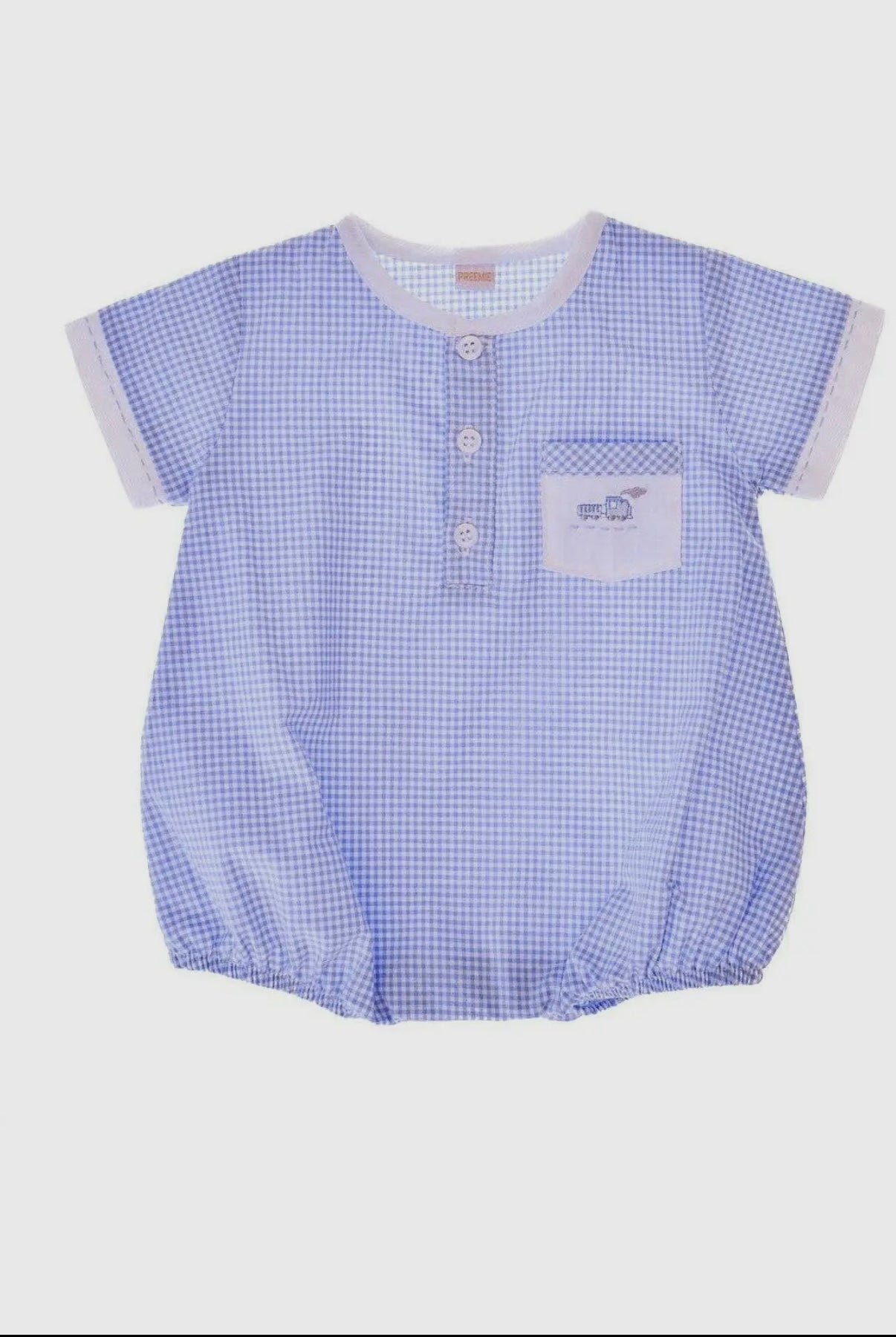 Carriage Boutique baby boy blue and white checkered creeper. Hand embroidery on pocket with playful train design. Button-up on front and snaps underneath to assist in dressing. A comfortable and cute one piece that is perfect for spring and summer! Newborn and infant boys will be absolutely handsome in this romper.