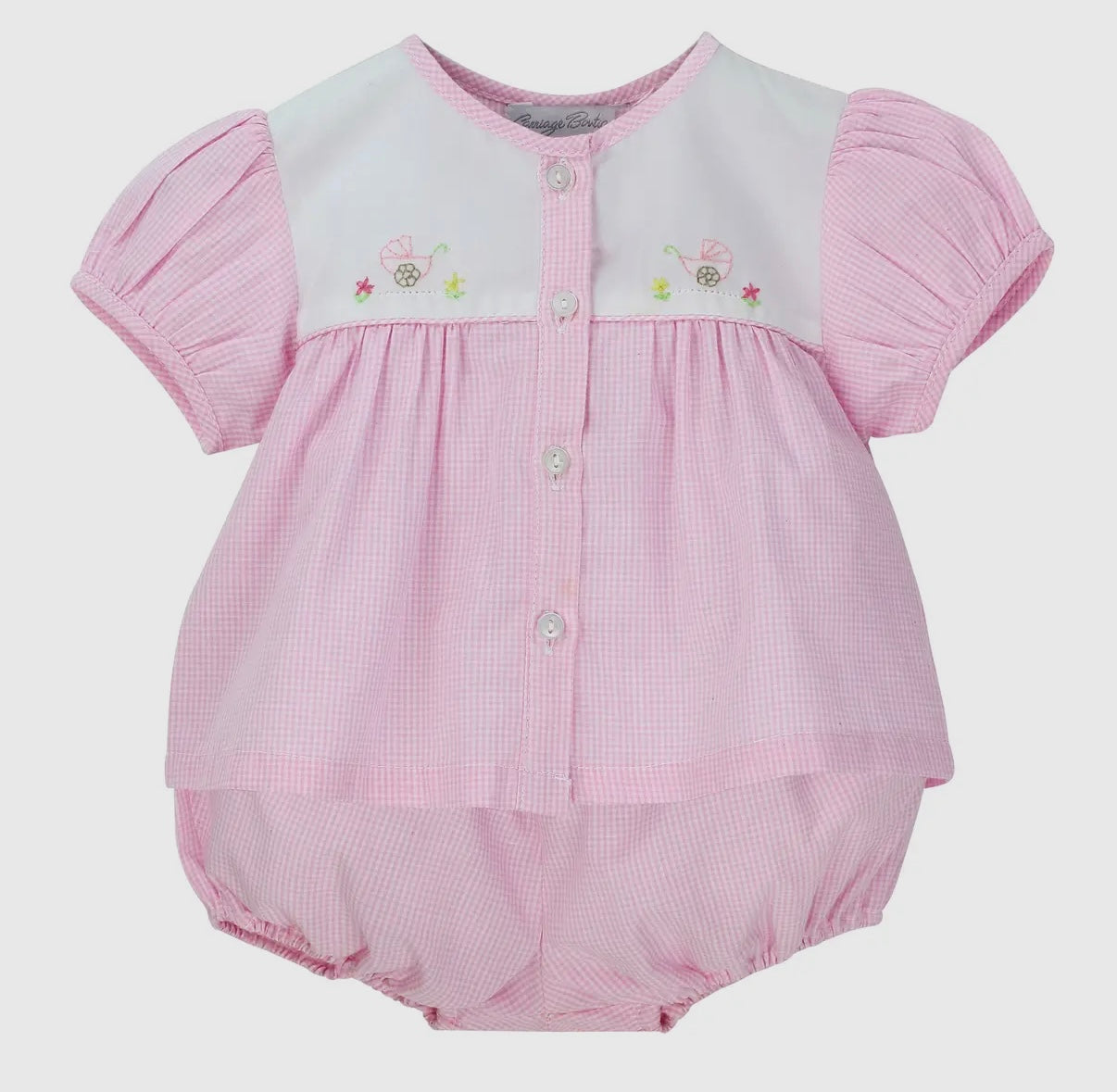 pink and white gingham checkered playful 2-piece short set for baby girls. This puffed short sleeve 100% cotton shirt and short is great for comfort. The adorable matching outfit is decorated with hand embroidered carriage designs and is perfect for any occasion! Adjustable waist for easy assist in dressing. Machine washable.