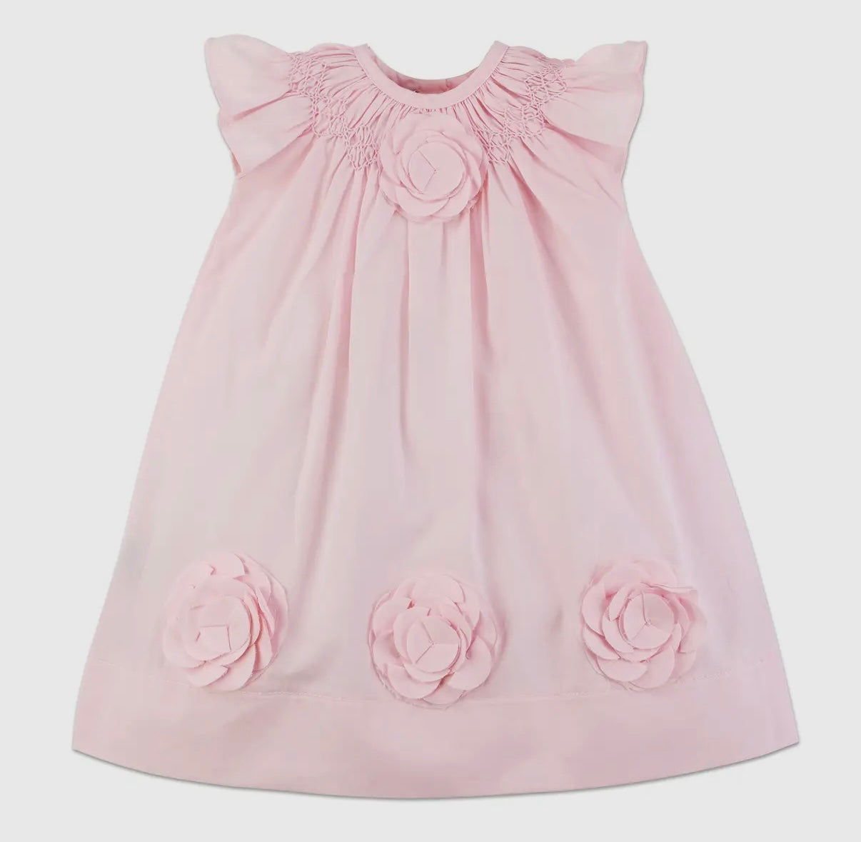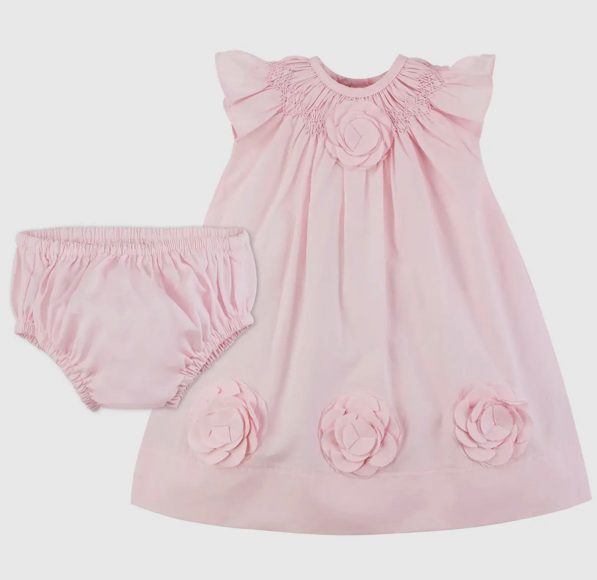 beautiful sun dress for newborn, infant, and toddler girls. This classic dress has a lot to offer with its style and elegance. The 100% cotton pink fabric is decorated with adorable cut out pink spring flowers. Machine washable. Great for many occasions!