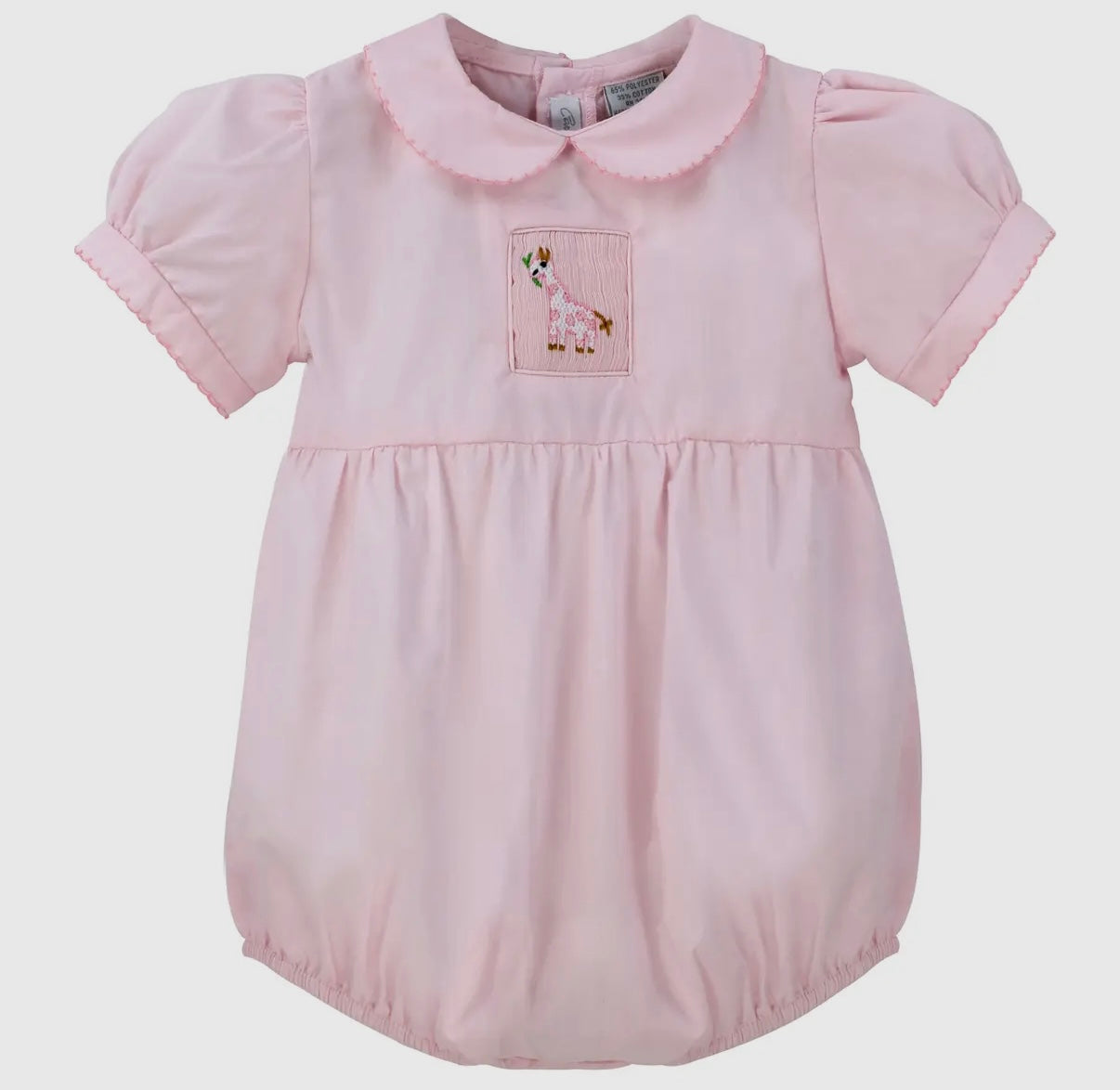 Carriage Boutique's baby girl pink bubble romper. A comfortable and cute one piece with a beautiful hand embroidered giraffe on the chest. Button-up back and snaps underneath to assist in dressing. Newborn and preemie girls will be absolutely adorable in this romper. 100% Cotton. Machine Washable.
