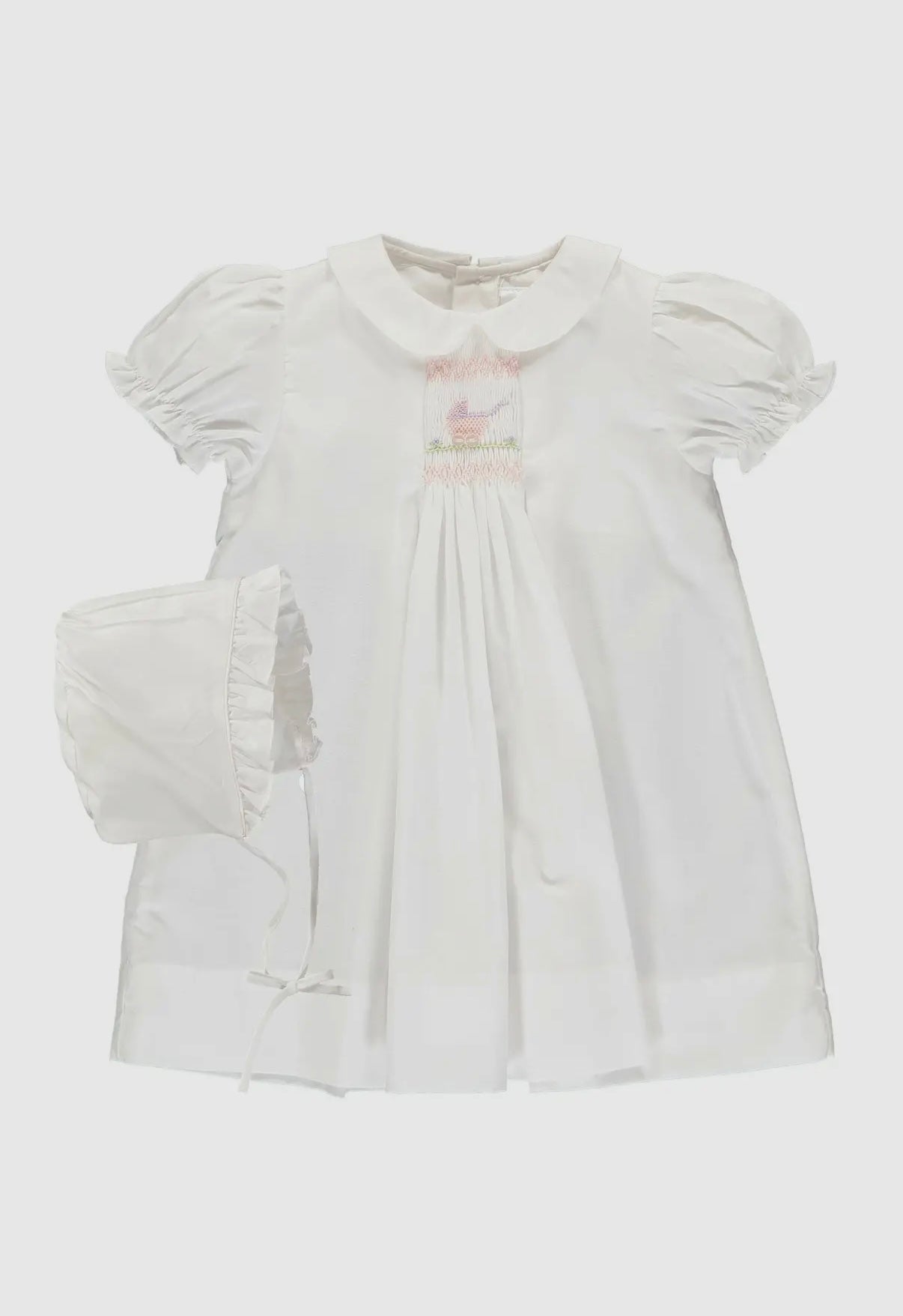 Our exclusive Layette Collection will be treasured for generations. This stunning newborn baby girl day gown features hand smocking and fine buttons down the back to assist with dressing. The elegant outfit is a classic piece of clothing perfect for any spring or summer special occasion. Matching Bonnet Included.