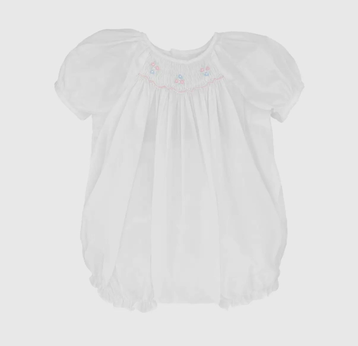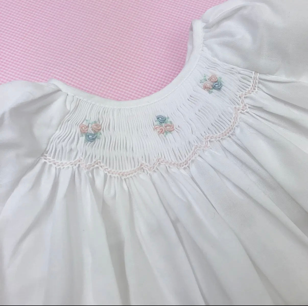 Featuring hand smocking and hand embroidered flowers with dainty seed pearls. The lightweight batiste fabric keeps little ones cool and comfortable and is easy to care for - just machine wash and tumble dry.