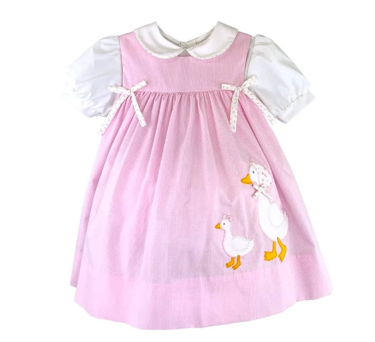 This adorable jumper style dress comes in a pink check fabric with a mama goose and baby goose applique on the front with floral print bows to accent it. Matching short sleeve peter pan collar shirt is also included.
