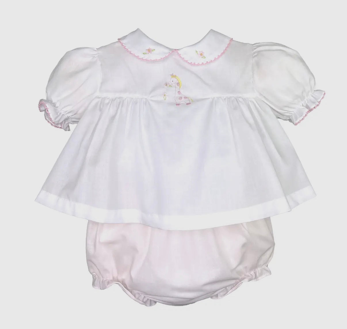 This outfit features an embroidered giraffe design on the front and scalloped edges trimmed in pink to add just the right amount of detail!