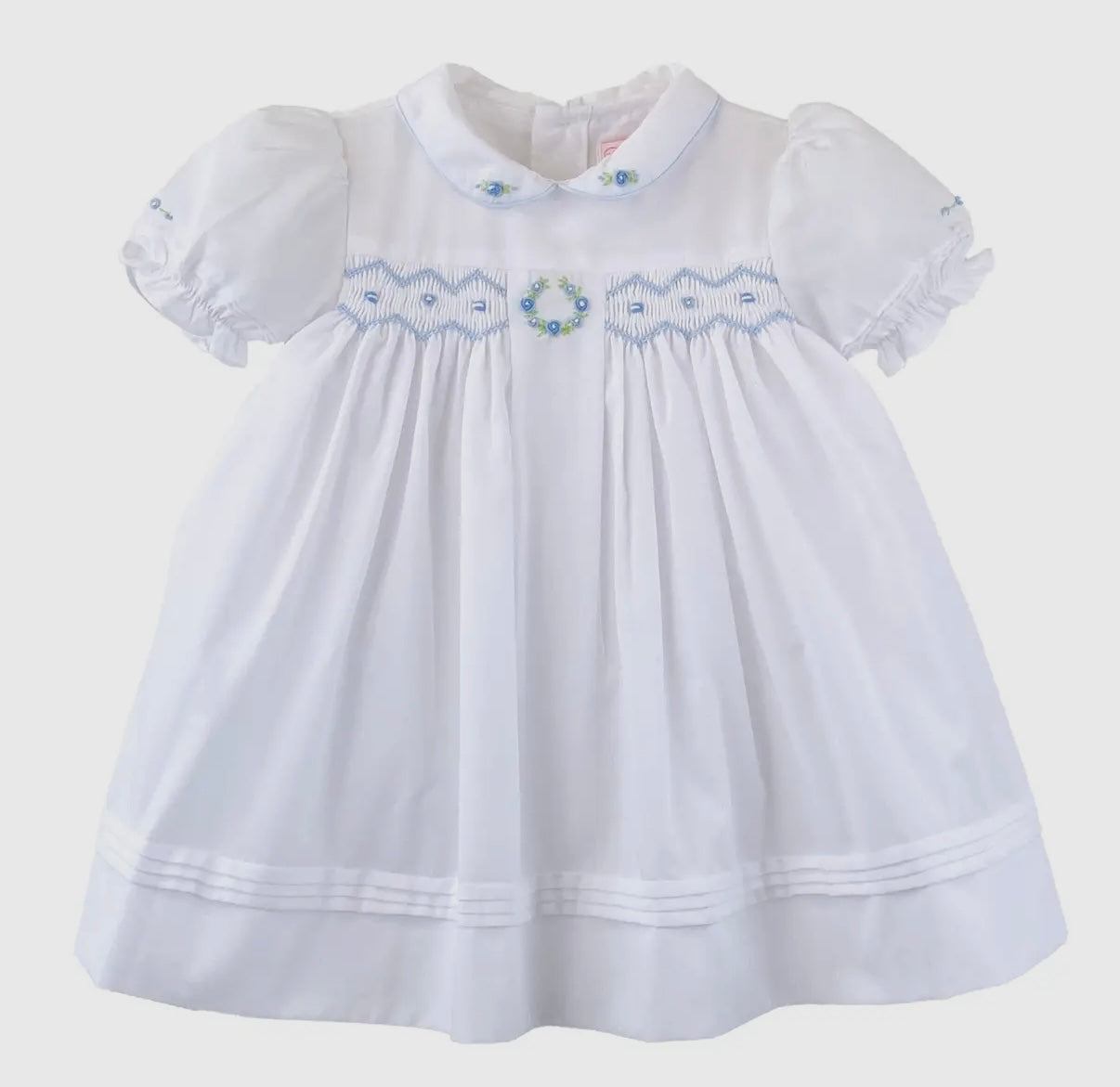 A classic dress with a smocked insert and embroidered flowers give this simple dress a fresh look.