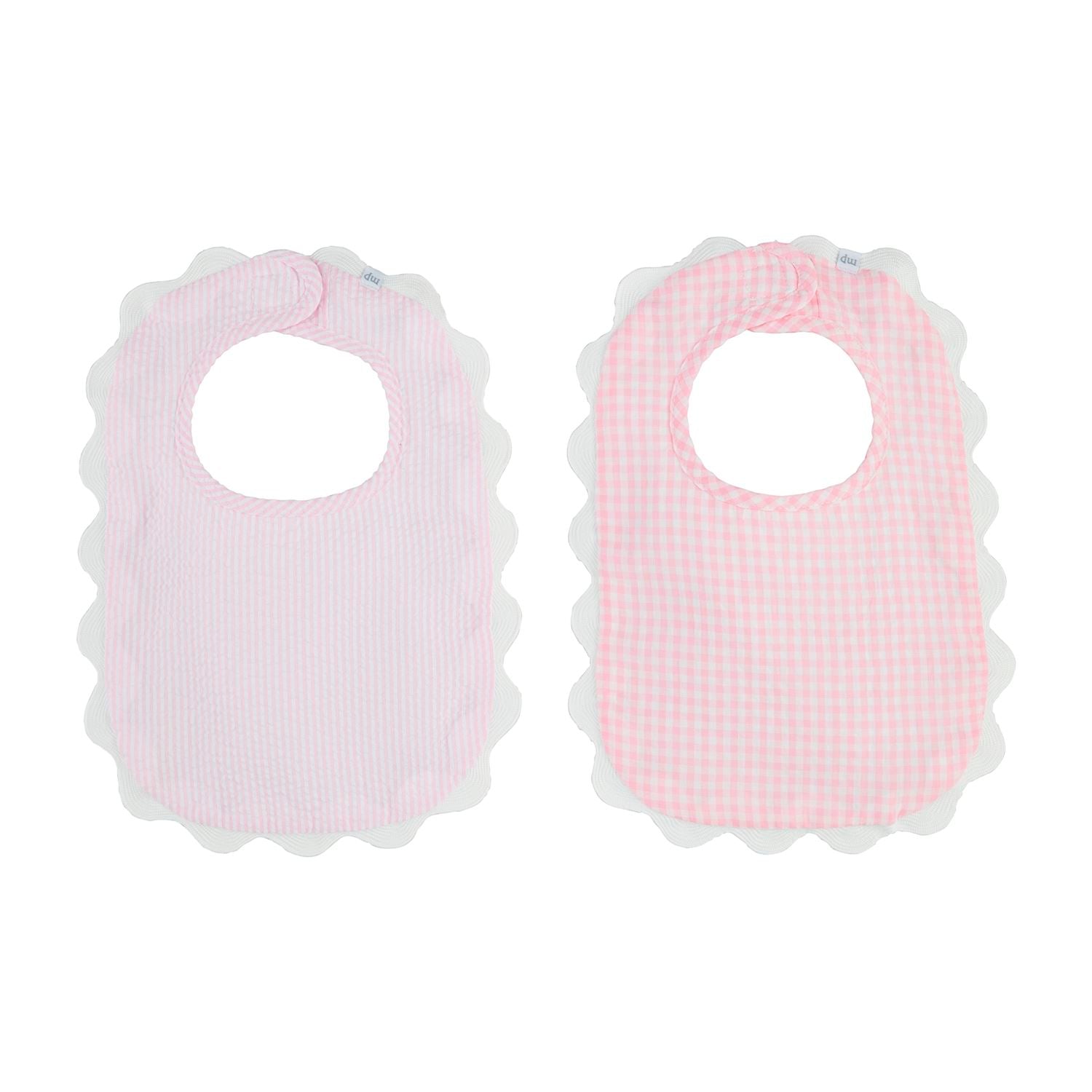 The Pink Seersucker Scallop or Gingham Scallop Bib is a charming and practical accessory for your little one. This delightful bib showcases a classic gingham pattern, enhanced by an oversized scallop ric-rac trim that adds a touch of whimsy and elegance. Designed with both style and functionality in mind, it features a soft cotton interlock backing that ensures comfort against your baby's delicate skin. The convenient hook and loop closure makes it easy to put on and take off, providing a secure fit during mealtime. Measuring 12" x 8 1/2", this bib offers ample coverage to protect your child's clothing from spills and messes. The front is crafted from a durable blend of 48% polyester and 52% cotton, while the back is made from 100% cotton, ensuring both durability and softness. Perfect for everyday use or special occasions, this bib combines practicality with a sweet, timeless design.