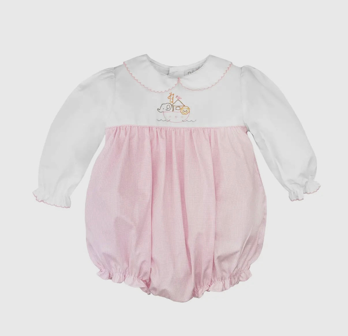 Our embroidered bubble comes in a soft pastel pink check fabric with Noah's Ark themed embroidery on the front. This peter pan collar long sleeve bubble is made with a cotton-poly blend fabric that is lightweight, airy and machine washable for easy car...