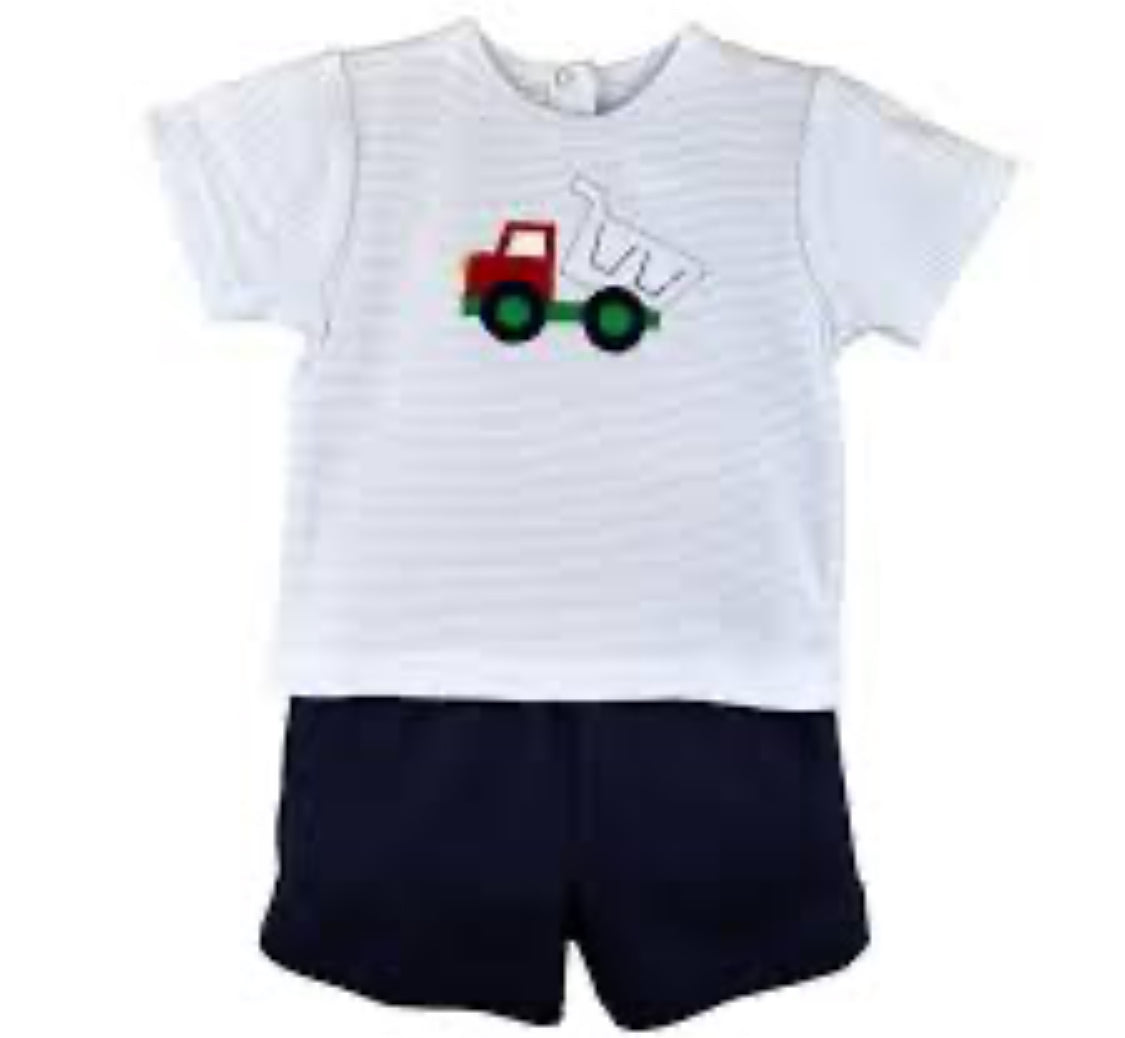 This Dump Truck set by Petit Ami is a must-have for any construction lover! It includes a blue mini-stripe crewneck shirt and an applique of a colorful dump trunk, paired with navy knit elasticized waist shorts.