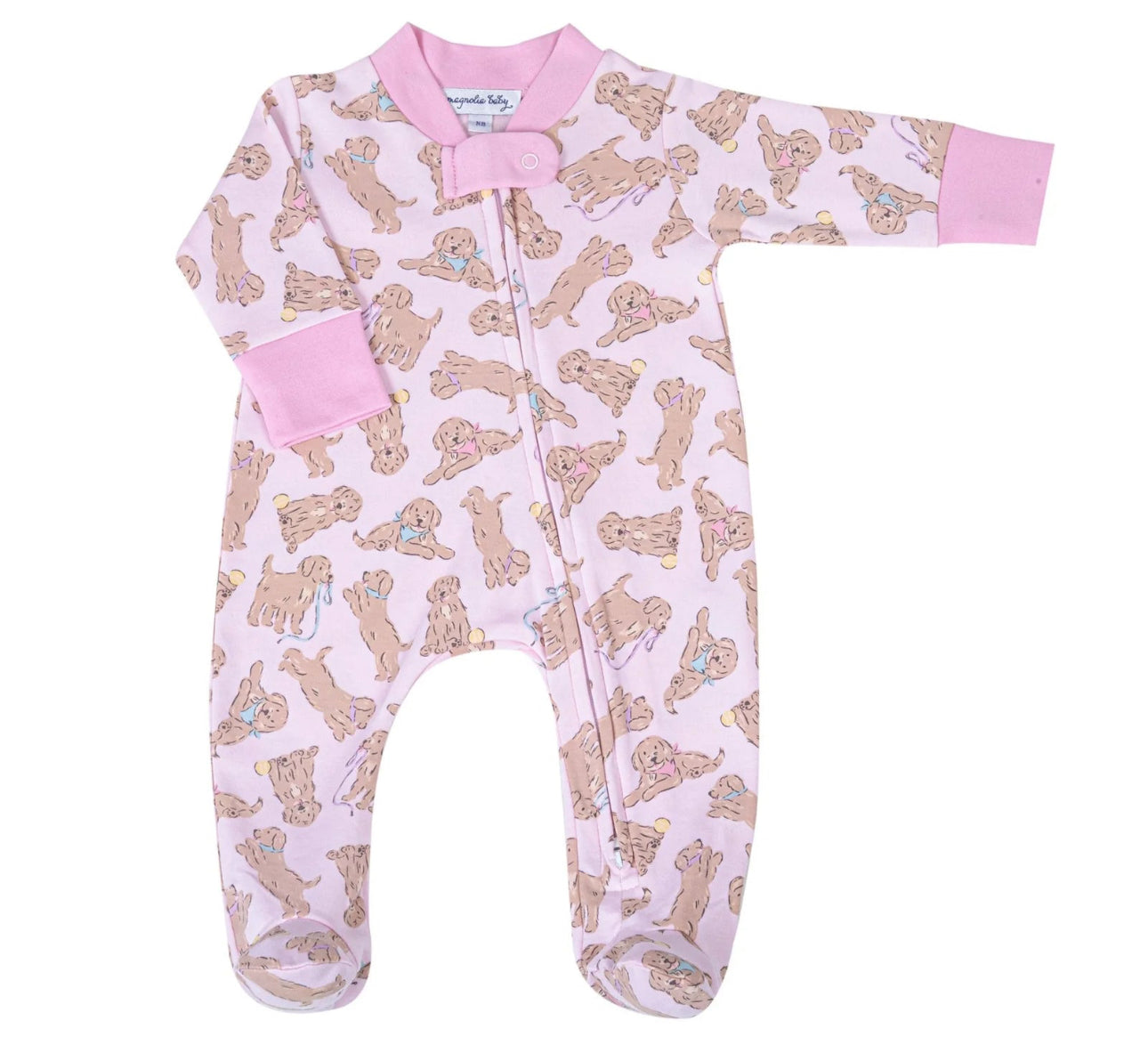 Let your baby experience the playful warmth of our Golden Pup Zip Footie - Pink, featuring adorable golden retriever puppies in a delightful all-over print.