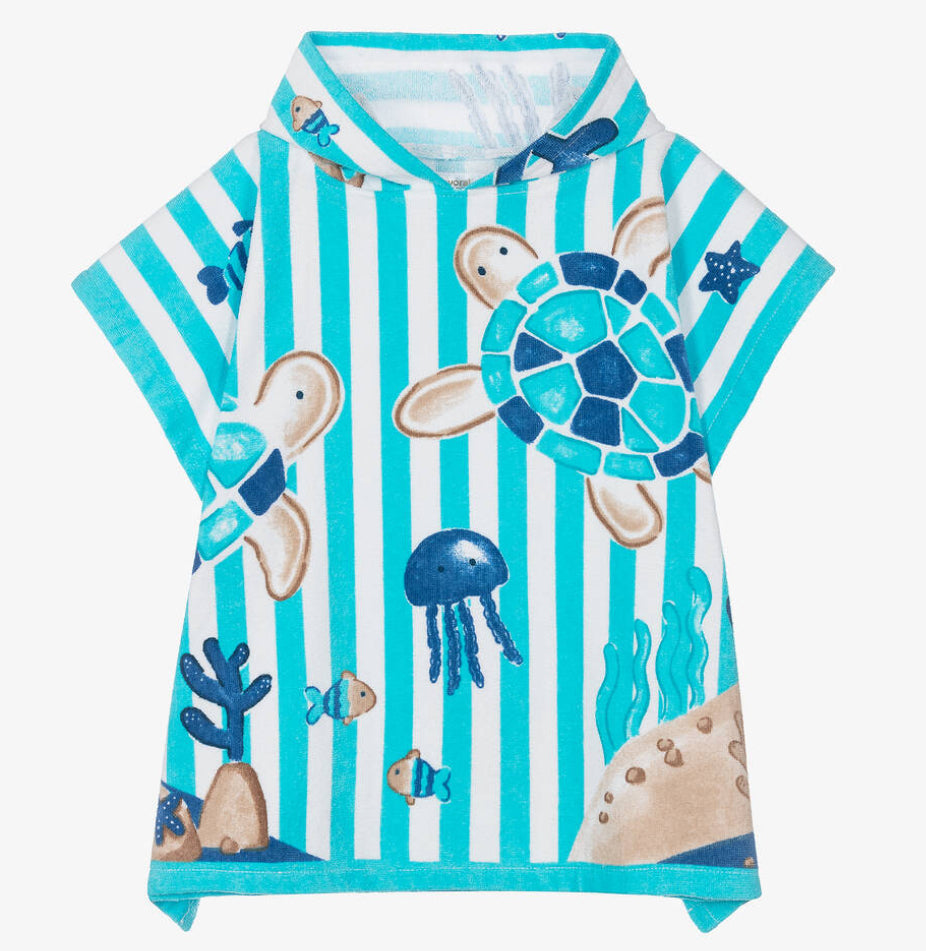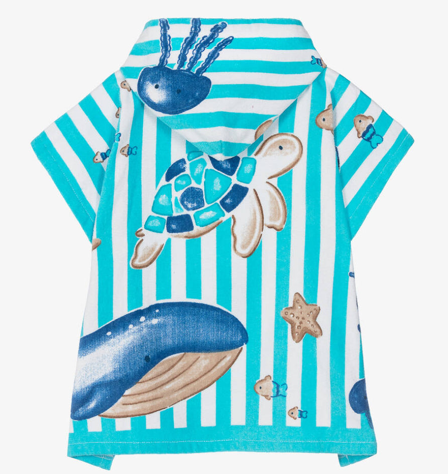 Ocean blue and white hooded poncho towel for boys by Mayoral, made in soft and absorbent cotton toweling. Lovely for keeping dry at the beach, pool or resort, this playful cover up has a fun jellyfish and turtle print for a holiday-inspired look. Boys swimsuit to match-sold separately